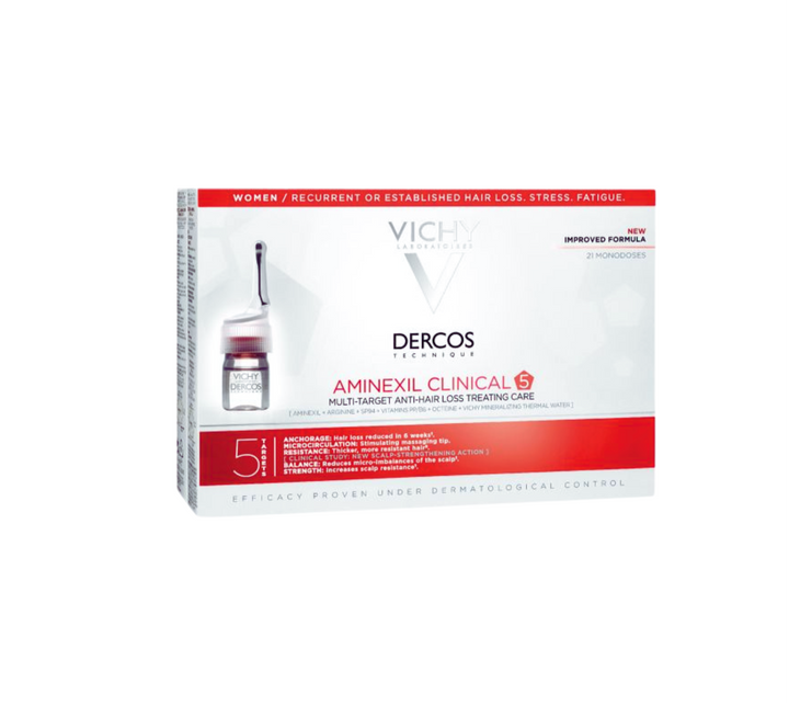 Vichy Dercos Aminexil Clinical 5 Ampoules for Women is a powerful anti-hair loss treatment designed with dermatological expertise. Combining Aminexil, a clinically proven molecule, with five active ingredients, including Vichy Mineralizing Thermal Water, SP 94, Octeine, caffeine, and arginine, this treatment targets hair loss from multiple angles. It helps anchor hair to the scalp, strengthens hair fibers, and reduces scalp micro-imbalances, promoting resilience and healthier hair growth. Ideal for reducing hair fall and boosting scalp resistance.